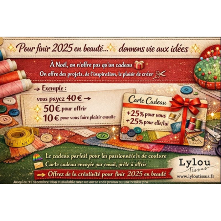 Cette carte cadeau est nominative et sera enregistrée sur son compte personnel Lylou Tissus.